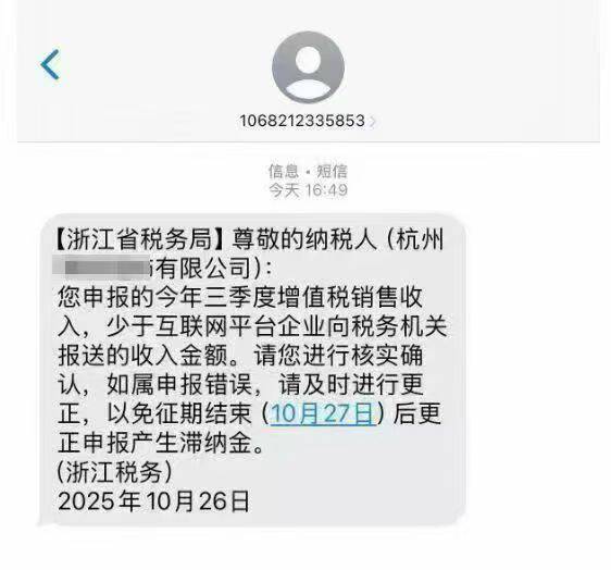 尊敬的纳税人:您申报的今年三季度增值税销售收入,少于互联网平台企业向税务机关报送的收入金额。请您进行核实确认,如属申报错误,请及时进行更正,以免征期结束(10月27日)后更正申报产生滞纳金。